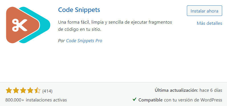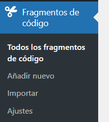 El primer paso fue instalar y activar el plugin Code Snippets. Fue muy fácil encontrarlo en el repositorio oficial de WordPress, y además cuenta con una excelente calificación por parte de los usuarios. Una vez activado, apareció una nueva opción en el menú lateral de WordPress llamada «Fragmentos de código».